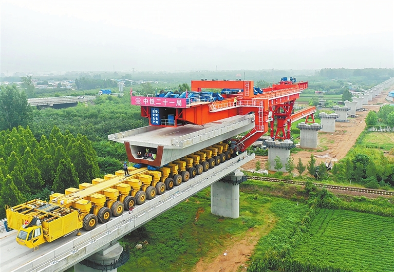 10月11日,中铁二十一局集团有限公司平顶山湛河制梁场的员工在利用大型机械运输、架设预制箱梁。