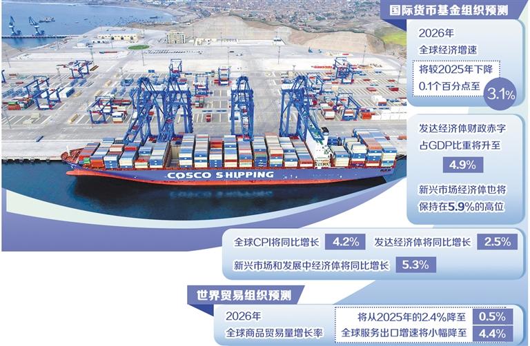 2025年,全球经济增长在一定程度上得益于部分企业因预期关税壁垒提升而采取的“前端备货”行为,以及人工智能(AI)产业硬件需求激增等暂时性因素的强力拉动。随着这些因素的效应在2026年逐步消退,全球经济增长的内生动力将面临更大考验。因此,国际货币基金组织(IMF)预测,2026年全球经济增速将较2025年下降0.1个百分点至3.1%。同时,增长分化态势持续。发达经济体经济增速预计为1.6%,动能疲弱;新兴市场和发展中经济体经济增速预计为4.0%,增长前景受到投资不振与债务高企的共同制约。